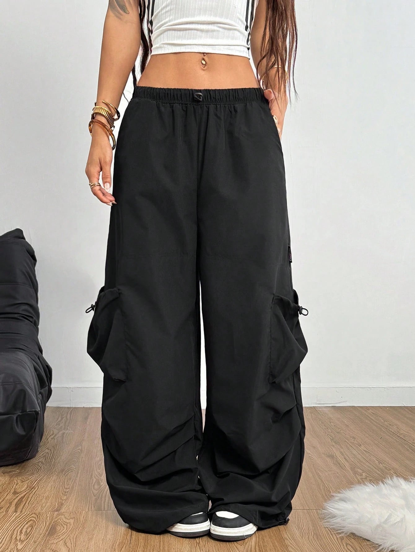 Engineered from premium parachute fabric, these wide-leg cargo pants offer superior strength and breathability for all-day comfort. The structured design features functional flap pockets and refined tape accents that elevate the classic cargo aesthetic. The generous leg opening creates an effortless, contemporary silhouette while maintaining excellent shape retention. Built to withstand regular wear without compromising quality, these pants are an essential addition to any versatile wardrobe. Suitable for casual settings and layered styling.